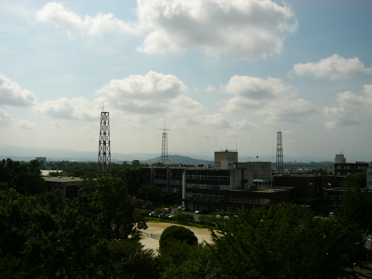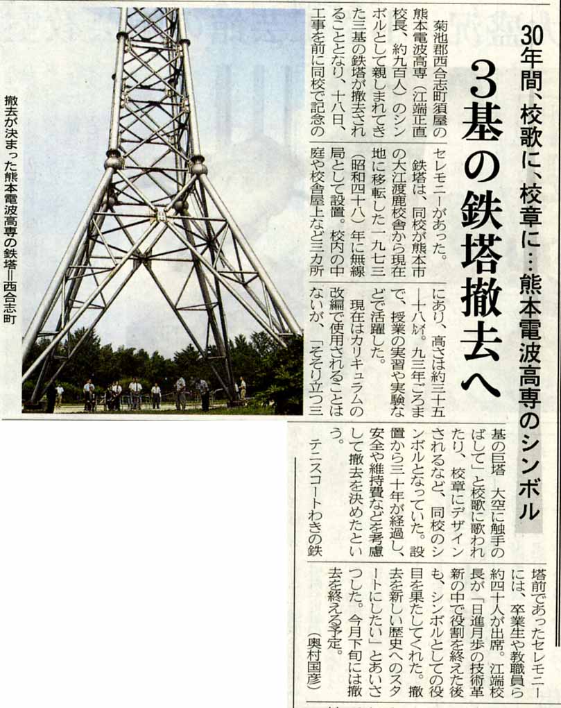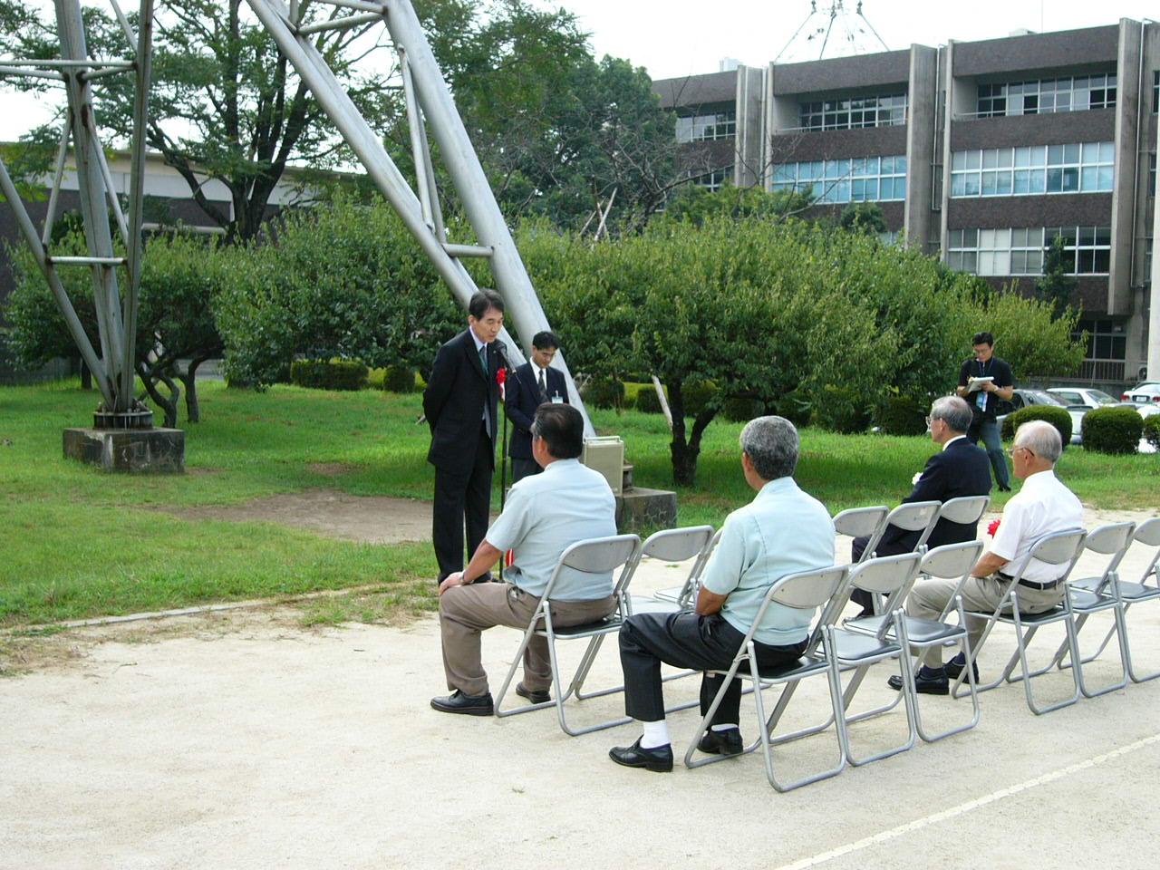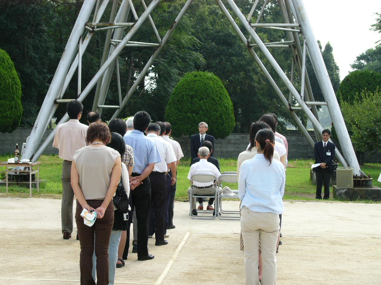 去る7月30日に開催された平成17年度同窓会総会の懇親会で母校江端正直校長からお話があったように(総会記事参照のこと)、母校のシンボルである三基の鉄塔が老朽化のため近々撤去される方針であったが、急遽、夏休み中の8月22日から27日までの間に撤去されることになった。本日8月18日午前9時から校舎棟北側、テニスコート横の鉄塔付近において、鉄塔撤去に伴うセレモニーが行われ、教職員、卒業生、工事関係者等約40名が出席した。