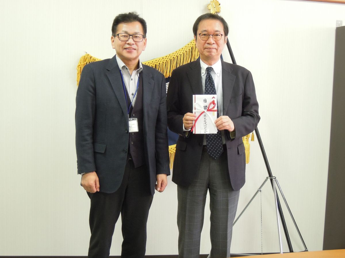 本日、清田副会長が高松校長にOB・OGの皆様からの寄付金の目録を贈呈しました。