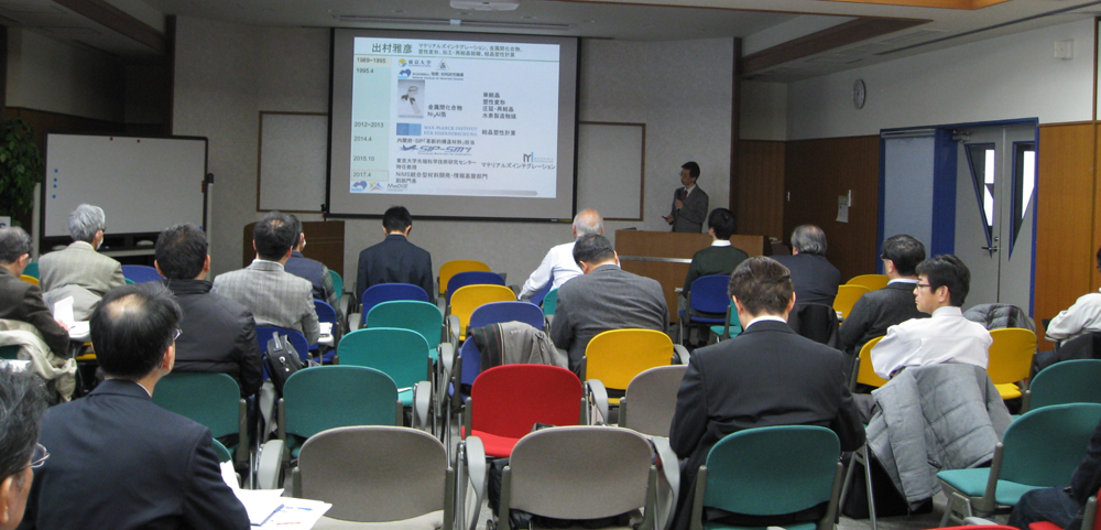 招待講演では、NIMSの出村先生に、近年のMIの進捗状況をわかりやすくご講演いただき、特に現在、出村先生が牽引されているSIPプロジェクト「マテリアル革命」の基本的考え方・展望をご紹介いただきました。続いて、本学土木工学専攻の加藤先生から、洗練された逆問題アプローチである「トポロジー最適化」について、基礎から応用までの話題提供をいただきました。また名工大の大塚先生からは、IoTの先進技術はもとより、IoTのスタータキット情報のご紹介があり、この分野の技術が現在非常に身近なノウハウになっていることをご教示いただきました。最後に、本学の知能システム学専攻の井手先生が、料理のレシピおよびその周辺情報に関する情報処理の枠組みについて講演され、料理という身近な話題が、データサイエンスによって構造化される様をご紹介いただきました。