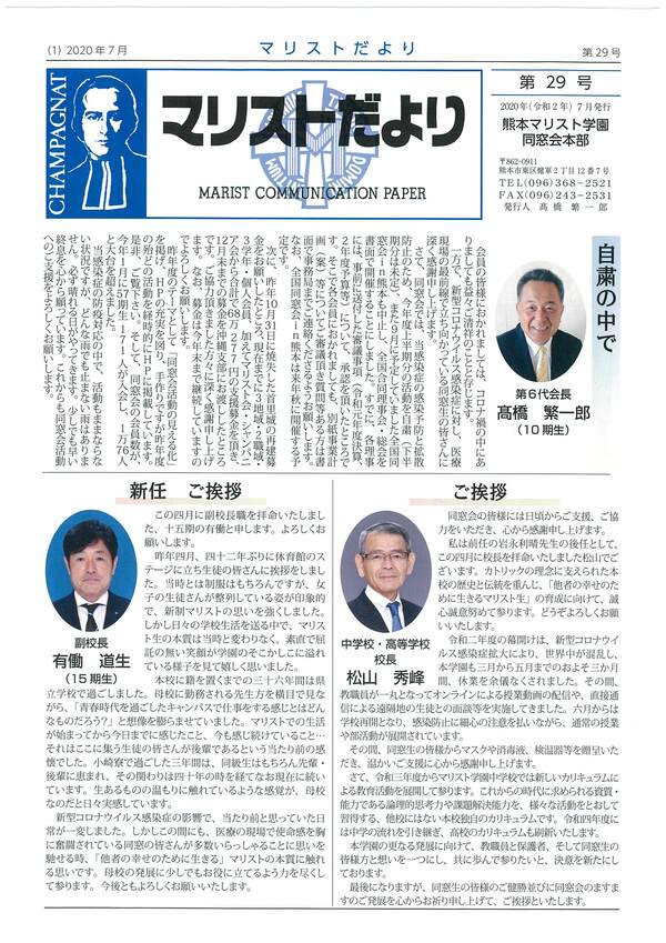 お知らせ トップページお知らせマリストだより29号発行しました❢ お知らせ 2020年8月27日 マリストだより29号発行しました❢ 今年度も無事にマリストだよりを発行することができました! お手元に届いていない場合は事務局のメールまでご連絡ください。 maristdousoukai@nifty.com また、マリストだよりはホームページからでもお読みになれます。 お知らせ 訃報