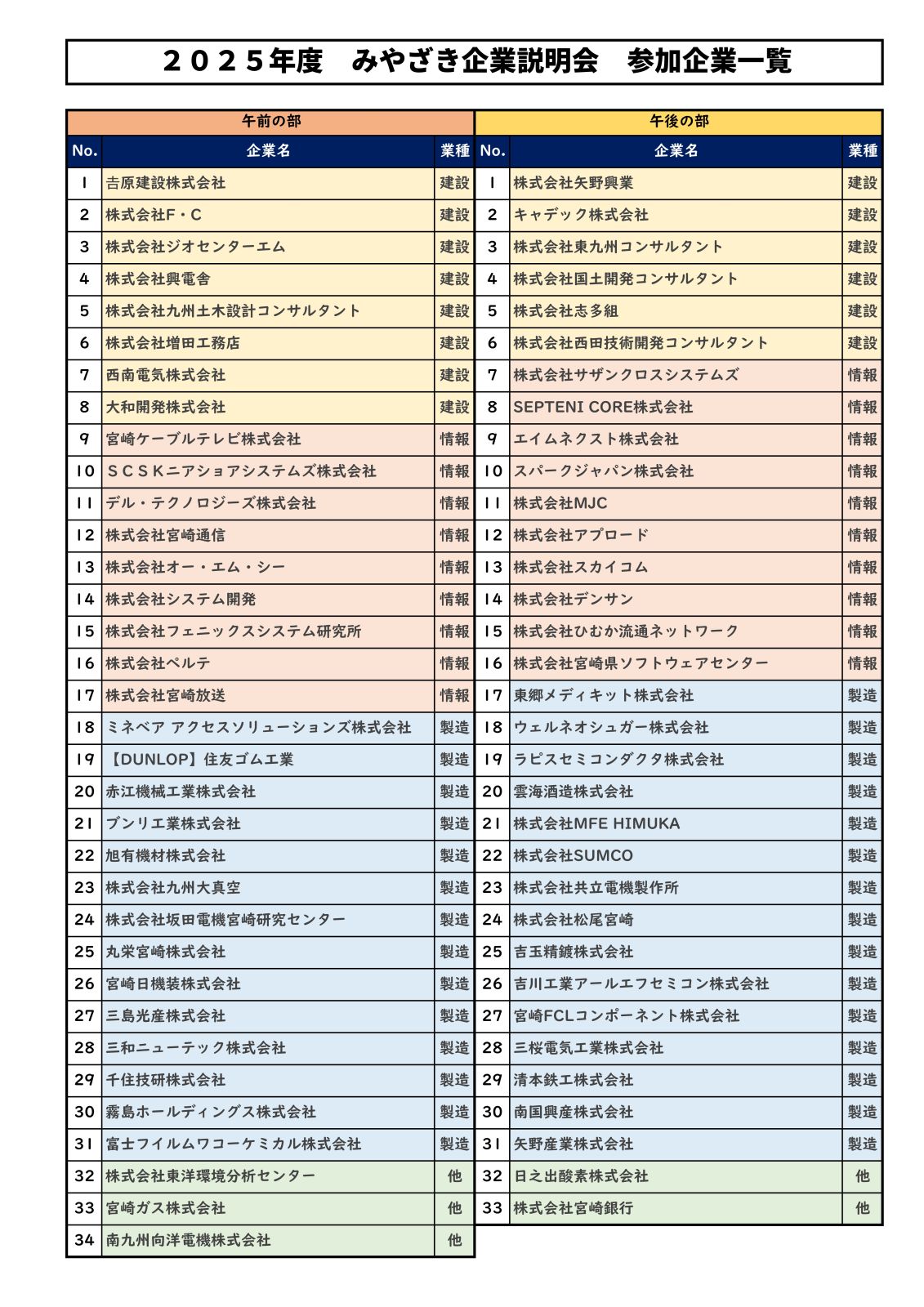 工学部同窓会主催の「令和7年度みやざき企業説明会」が12月5日(金)に開催されます。