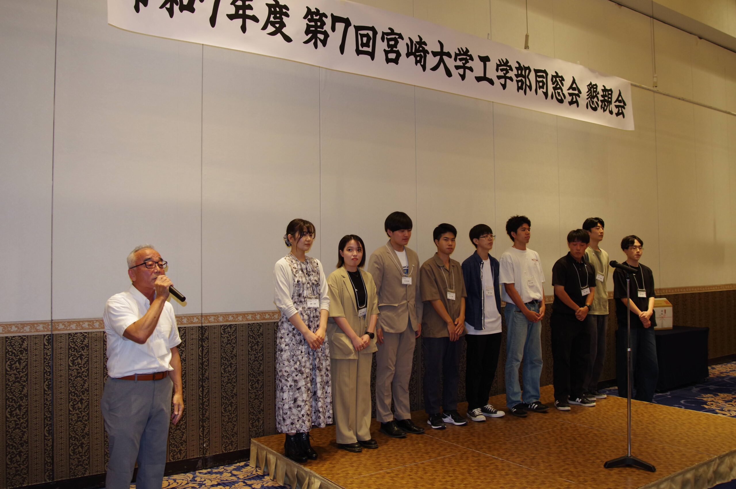 宮崎大学副学長の淡野先生の乾杯のご発声を頂き、歓談を挟み各地区の工学部会の会長や代表幹事の方からご挨拶を頂きました。2024年卒業生および2025年の代表幹事にも登壇いただき、今後の同窓会の若手参加に対し盛り上げていきたいとの頼もしい言葉を頂きました。