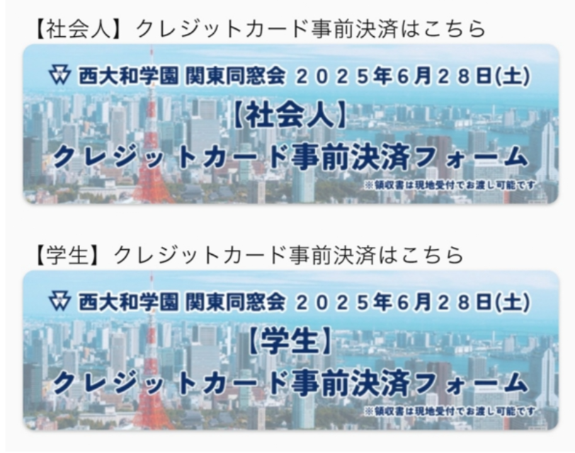 関東同窓会は今年も進化し便利になります。新たな取り組みとして参加費のクレジット事前決済を導入いたします。なお、現金ご希望の方は会場にての現金決済も受付いたしますのでご安心ください。