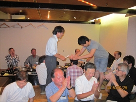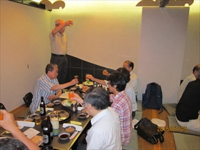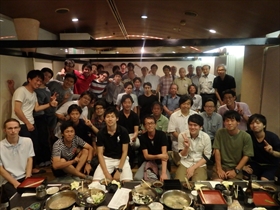 毎年難波で夏に実施されている電子物理5講座(旧電子3講座)全体の同窓会に8年ぶりに出席しました。この同窓会は講座 全体の縦の繋がりで数十年続いている行事で、おそらくこれだけの規模は電気系の中でも一番だと思われます。今年は“きんいち難波店”という居酒屋で先生方 4名、OB23名現役生13名計40名もの参加があり、懐かしい話や最近の大学の状況、その他色々な話題で大いに盛り上がりました。