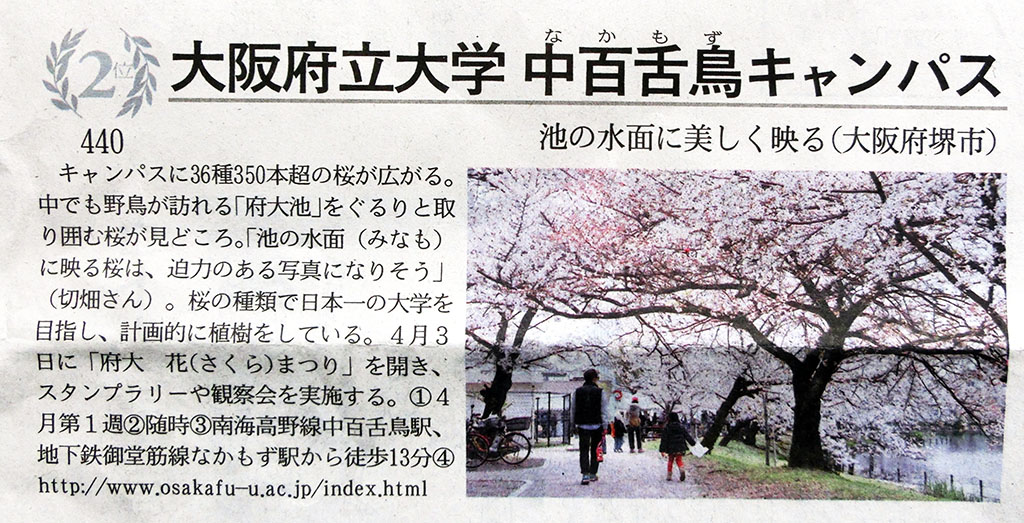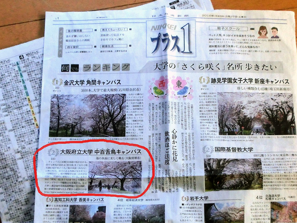 日本経済新聞の毎土曜日号の特集 “NIKKEIプラス1”の日経『何でもランキング』で「大学の「さくら咲く」名所」(2016/2/27)が特集されました。