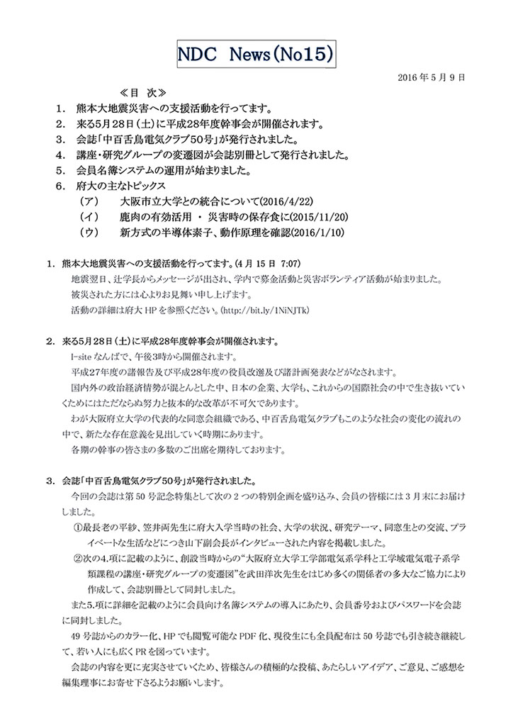 しかし、今回の第15号より形態を変えて「NDC news」そのものは中百舌鳥電気クラブのホームページの 『 NDCの活動 』 にアップし、メルアドを登録頂いている皆さんには「NDC news」がホームページにアップされた旨の通知メールのみ送らせて頂く事にしました。