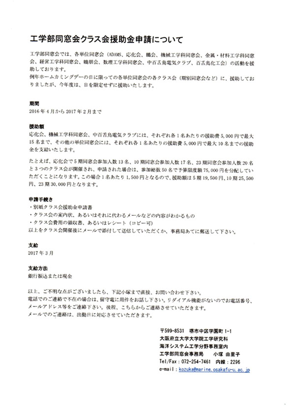 詳細と手続きについては添付の「工学部同窓会クラス会援助金申請について」をご覧ください。