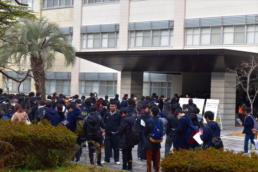 それに先立ち前期日程の『現代システム科学域』『生命環境科学域』『地域保健学域』の入試が開催されました。写真はその入試に向かう受験生の風景です。