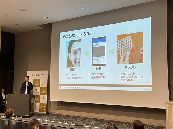 私たち、OMEN(Occupational therapy and Mental health Electrophysiology Nexus)チームは、【CraftMind: 手工芸を活用したメンタルヘルスプロモーション】というビジネスアイデアを提案させていただきました。 CraftMindは、手工芸の癒し効果と最新の脳科学技術を組み合わせた、精神的健康改善のための革新的ツールです。近年の調査によると、日本人の72.9%が普段の生活でストレスを感じており、92.8%の人が精神面での不調を感じています。私たちリハビリテーション学研究科 作業療法学領域から生まれたチームであり、日々、作業を行うことによるリハビリの効果を研究しています。今回提案させていただいたCraftMindはチームによるこれまでの知見を活用し、手工芸活動が持つ脳波と自律神経機能への影響に関する複数の査読付き論文を基に開発されました。 特徴として、最先端の脳波・自律神経測定機器を用いること、高度な分析機能を持つスマホアプリを使用する点、多様な手工芸キットをメンタルヘルス改善のツールとして用いる点が挙げられます。ストレスを発散したい一般ユーザーのほか、生産性を向上させたい企業従業員や、学習効率を向上させたい生徒や学生など、広いターゲットを想定しています。これらを導入することによって、ストレス低下や集中力と創造性の向上、生産性の向上などのほかに、ひいては自律神経機能の調整、睡眠の質向上、血圧改善などを通じて社会全体の健康増進が見込まれるのではないかと考えています。 <受賞コメント:大類淳矢氏> 今回、ビジネスアイデアコンテストにおいて電気クラブ賞を受賞させていただき、大変光栄に感じております。私たちは普段はそれぞれの現場で臨床実践や教育、研究等を行いながら、確かなエビデンスのもとでのリハビリテーションの提供を目指しています。普段の学会発表や論文執筆とは異なる慣れない環境での発表でしたが、私たちのテーマに興味を持っていただけたことや、他のチームのアイデアを聞かせていただけたことが大変良い経験となりました。今回広がったビジネスの観点も取り入れながら、今後さらに研究活動を加速させてまいりたいと思います。 最後になりましたが、ビジネスアイデアコンテストに携わっていただいたすべての皆さまと私たちのチームを支援してくださったすべての皆さまに、心より御礼を申し上げます。 |
