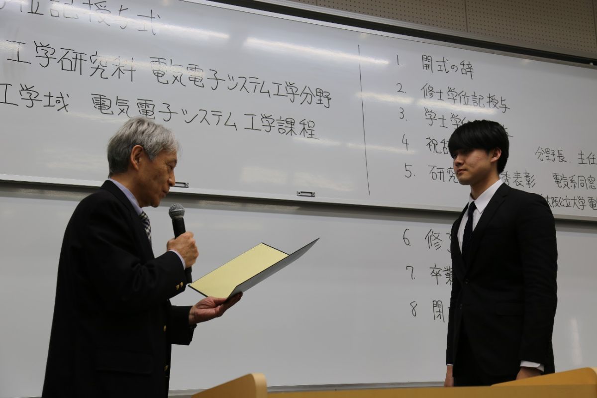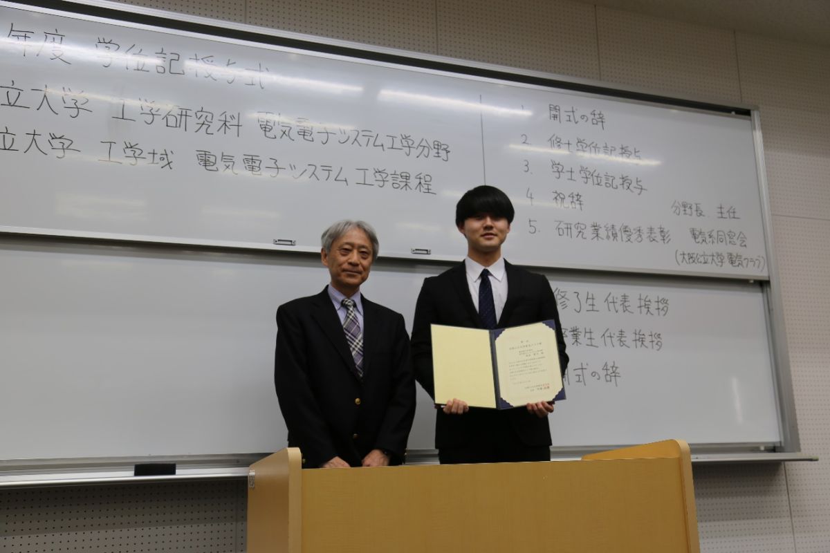 【電気クラブの内藤会長より電気電子システム工学分野の西本賢司さんに電気クラブ賞が授与されました。】