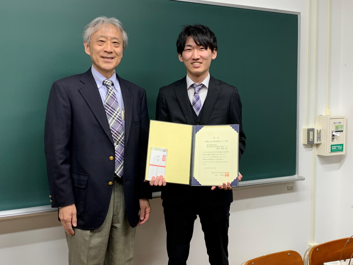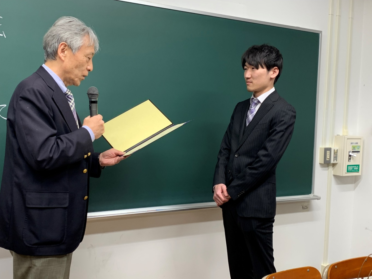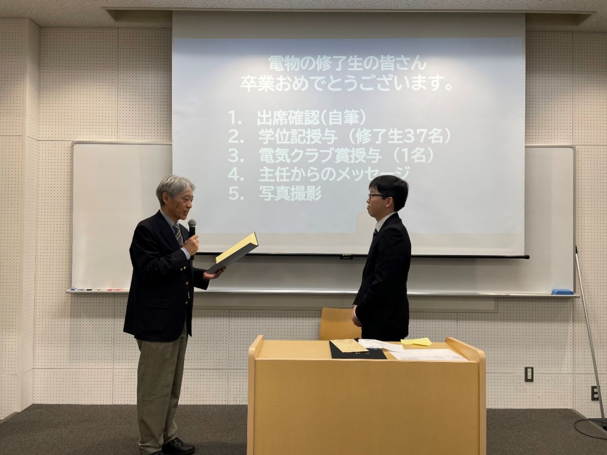 【電気クラブの内藤会長より電子物理工学分野電子物性コースの服部秀政さんへ電気クラブ賞が授与されました。】