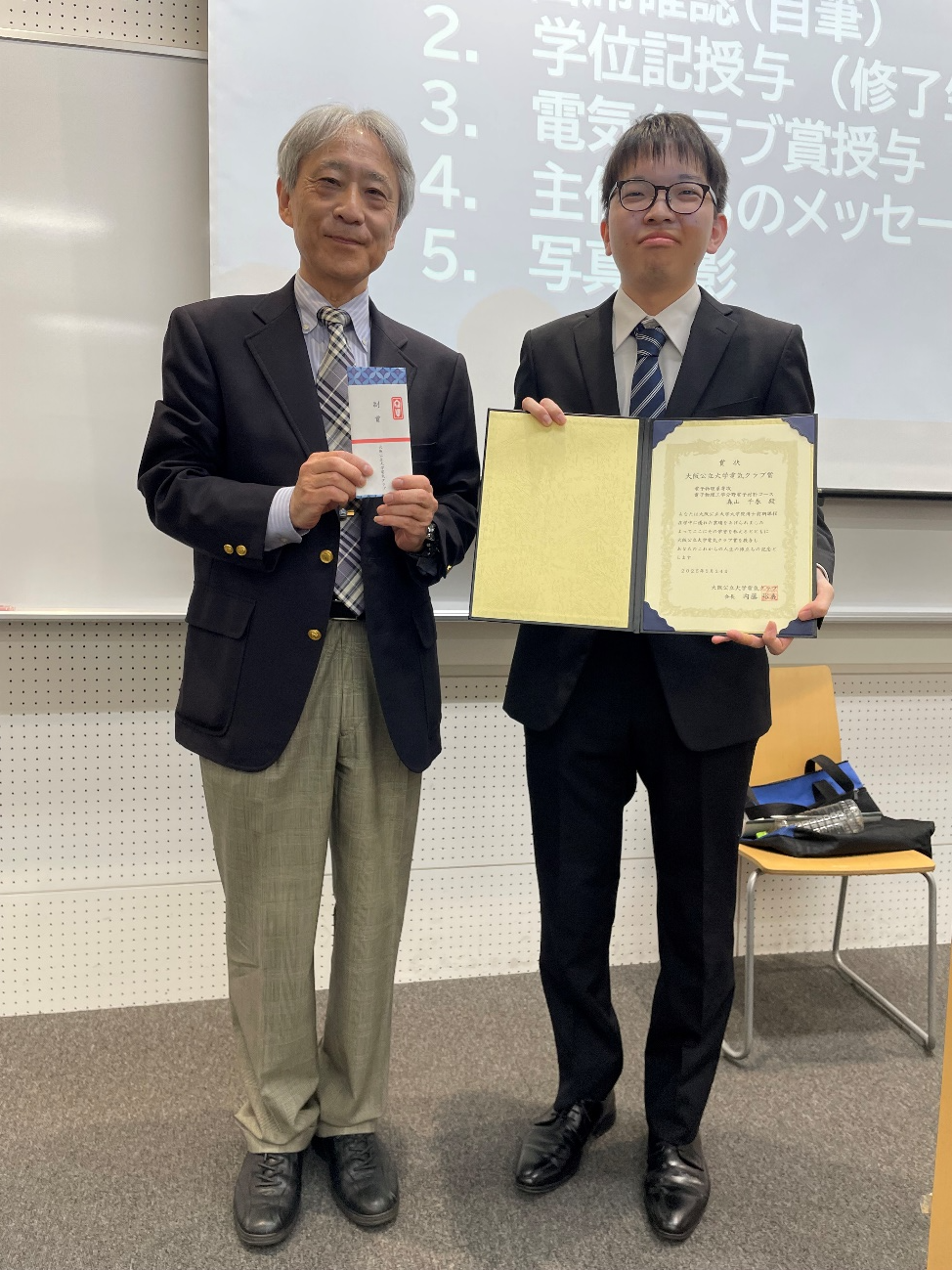 2025年3月24日卒業式の日に、第二回電気クラブ賞の授賞式を行いました。