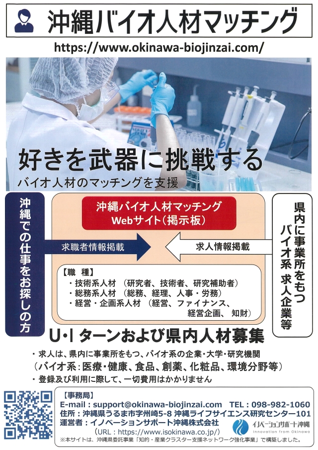 バイオ系の人材ポータルサイト「沖縄バイオ人材マッチング(https://www.okinawa-biojinzai.com)」のご案内を致します。