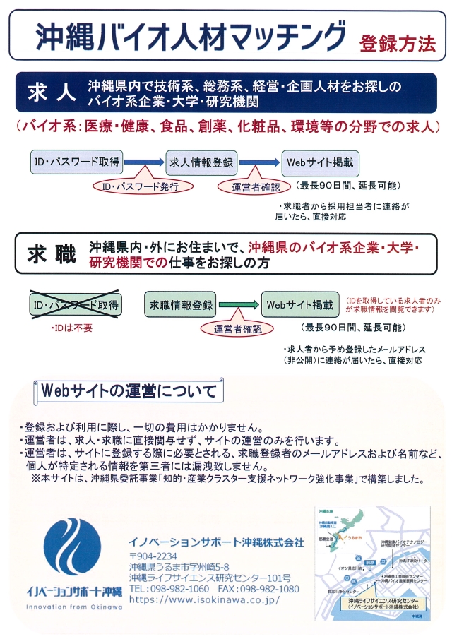 - Webサイト(掲示板)は、沖縄県のベンチャーインキュベーション施設、「沖縄ライフサイエンス研究センター(うるま市州崎)」の指定管理者でもあるイノベーションサポート沖縄(株)が運営しています。
