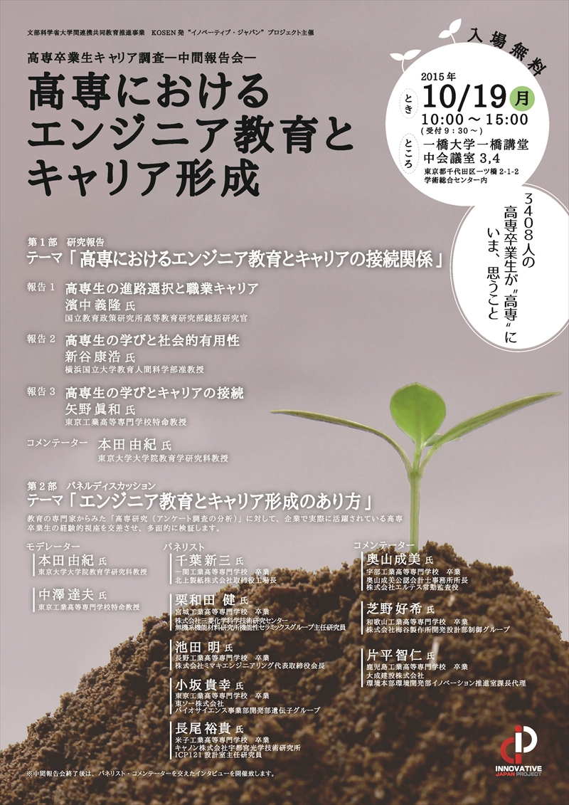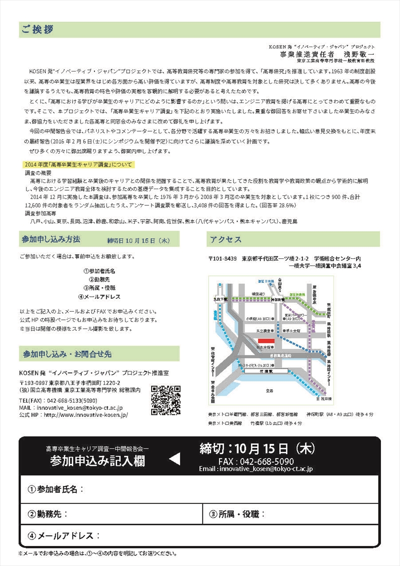アナウンス トップページコンテンツアナウンス高専卒業生キャリア調査—中間報告会— 2015年10月19日開催 アナウンス 2015年9月28日 高専卒業生キャリア調査—中間報告会— 2015年10月19日開催 高専卒業生キャリア調査—中間報告会— コメントする コメントをキャンセルメールアドレスが公開されることはありません。 ※ が付いている欄は必須項目です名前 ※ メール ※ サイト コメント ※ Δ コンテンツ イベント アナウンス ミライカナエ☆プロジェクト 三十路会報告 同窓生が起業した会社