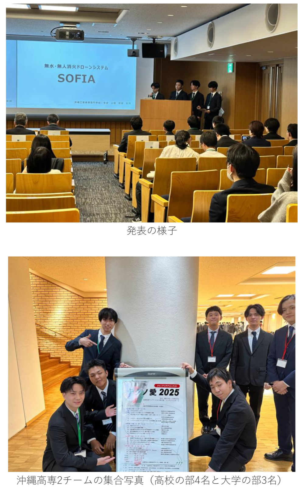 提案内容は、近年増加・大規模化傾向にある山火事への新アプローチとして、音波消火器とAI、ドローンを用いた次世代初期消火システムです。アイデアの独創性と高専生ならではの技術力を評価されての本選発表となりましたが、本選の結果は惜しくも健闘賞でした。高校生の部とはいえ、どのチームも高倍率を勝ち抜いた斬新かつ完成度の高い提案ばかりで、大きな刺激を受けました。そのような中でも堂々と我々の研究の成果を発表することができ、多くの有意義なフィードバックを頂けたことは大きな収穫となりました。