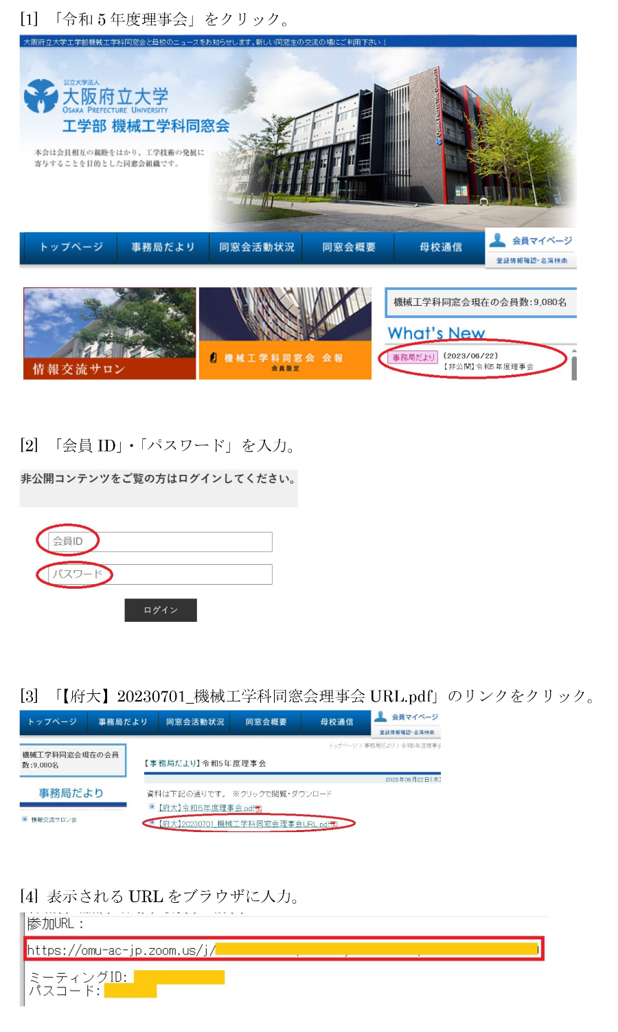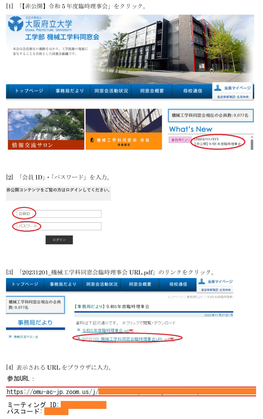Web会議のURLは、開催数日前に同窓会Webサイトにアップロードします(要ログイン)。