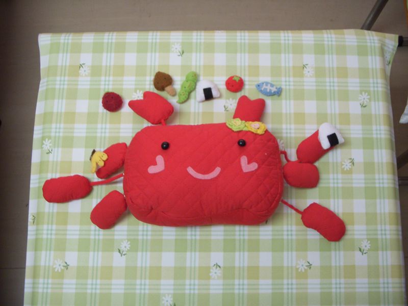 ![]() カニと食物をモチーフにした布製おもちゃ |