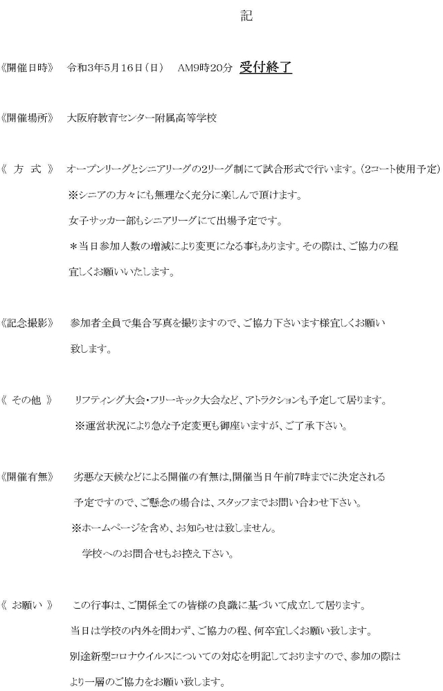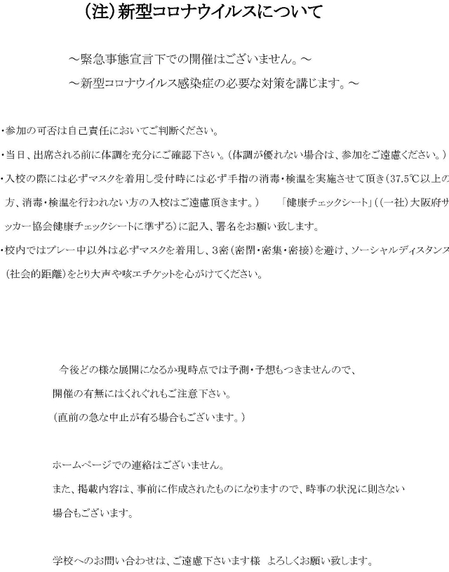 コロナ禍の中OB会が開催されるのは、非常に勇気ずけられ希望が湧いてきます。 参加者の方々は、感染予防を徹底して大切な母校また開催スタッフに迷惑を掛けないように心がけましょう。 大阪の感染状況なども非常に気がかりですが、母校のサッカー部に関係を持った人だけでも今以上コロナ対策に対応しなけれはならないと気づきました。
