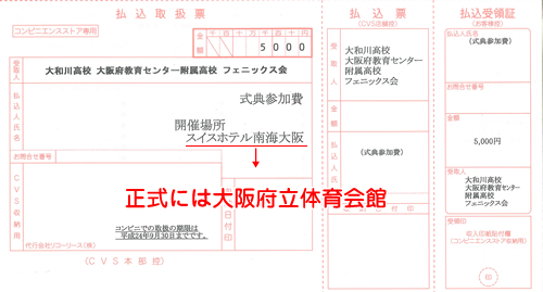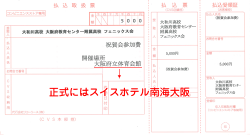 式典の祝賀会の両方に御参加される方は、2枚とも、払込用紙裏面のコンビニへお持ちいただきお支払いください。