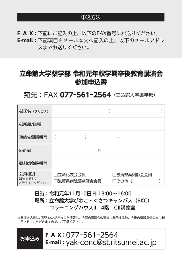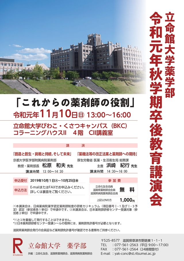 今回は、薬学部と立命化友会との合同企画として、卒後教育講演会を開催します。