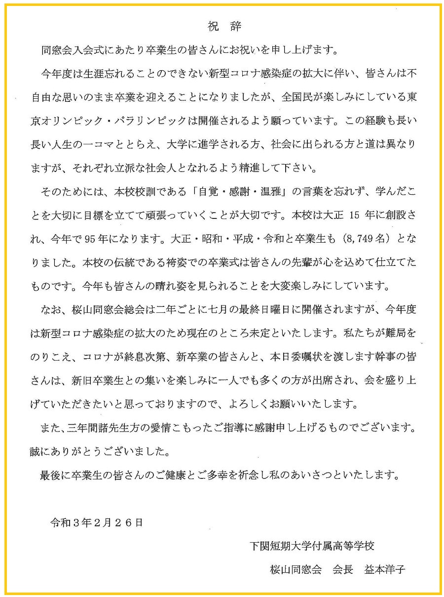 トップページお知らせ お知らせ 2021年2月26日 令和2年度入会式 新型コロナウイルス感染症のため毎年恒例の体育館での入会式は中止となりました。 益本会長よりこの度卒業し新会員になられる46名の皆様にお祝いのお言葉を紙面にて贈りました。 2020年3月10日 令和元年度入会式 令和元年度入会式を行いました。 益本会長より委嘱状が授与されました。 2020年2月14日 入会式・卒業証書授与式 入会式(2019年度卒業生) 2月28日(金)に本校体育館で入会式を行います。 第72回卒業証書授与式 3月1日(日)卒業証書授与式を挙行いたします。 1234567 お知らせ