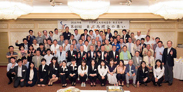 昨年までの堅苦しい「総会」を改め「集い」と称し、大学より荻野喜弘理事長、下関市より本間俊男副市長、中村光男東京事務所長、同窓会本部より中村信悟副会長をお迎えし、また現役学生を加えた総勢61名での集いとなりました。