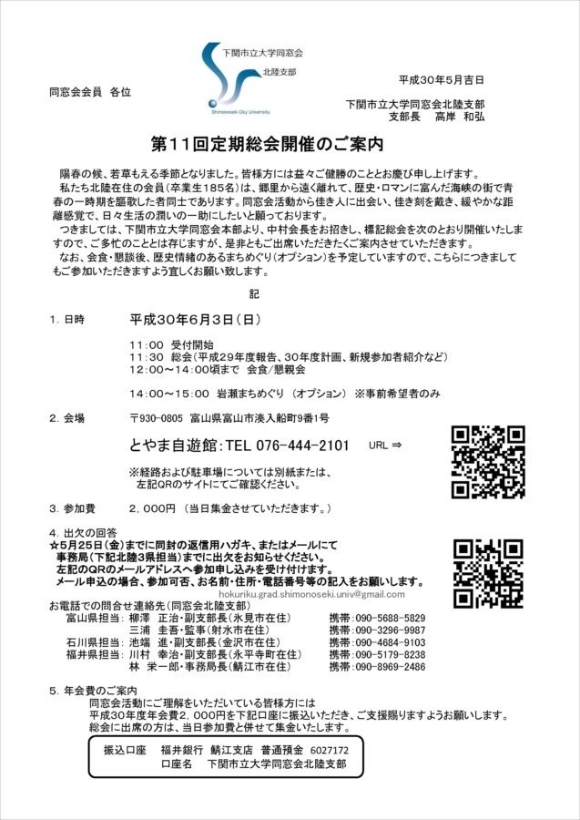 第12回下関市立大学同窓会北陸支部総会開催のご案内