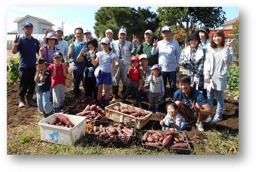 当日は、日ごろの行いを象徴するような好天に恵まれ、9会員が子連れ・孫連れで、総勢10家族23名参加し、すくすくと成長したサツマイモ(品種は焼き芋に最適な「紅はるか」)を収穫しました。