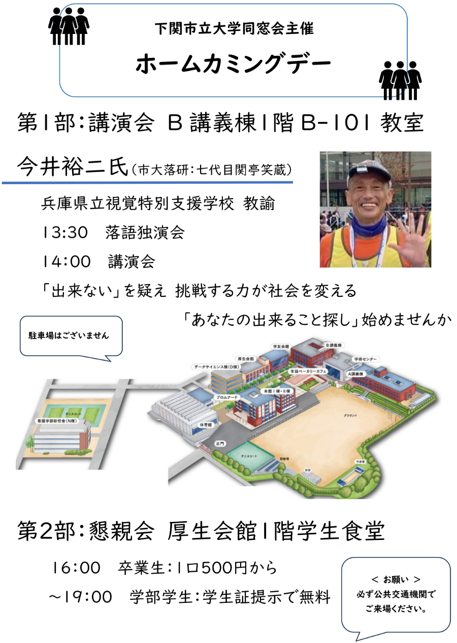 下関市立大学は来春看護学部の設立で名実ともに「総合大学」となり、「世界に通用する大学」を目指しています。この発展は、同窓会としても嬉しい限りです。同窓生の皆様、大学にエールを送りましょう。