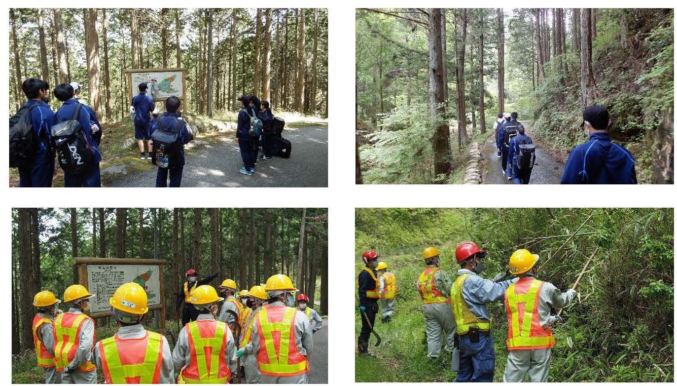 鴨山は、地域の先人が田口高校開校のために木を育てた特別な場所。新入生はまず鴨山に行き、田口高校の歴史や自然の豊かさ、山を育てることについて学びます。6月1日は普通科1年生が「鴨山合宿」として訪れ、演習林内の踏査などを行い、クラスメートとの親睦も深めました。2日には林業科1年生が、演習林での最初の実習に取り組みました。緊急事態宣言が延長されたため、普通科、林業科いずれも日帰り日程に変更しましたが、演習林内の自然を体感したり林業科は鎌を使う実習で緊張したりと、初めての鴨山で充実した時間を過ごしました。