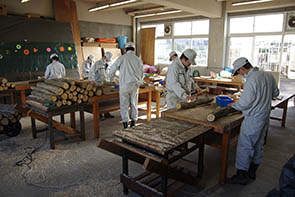 今年度も林業科でシイタケの菌打ち実習が行われています。毎年冬のこの時期に行われ、林業科1年生の生徒が原木1本1本に「種駒」を打ち込みます。種駒の打ち込まれた「ほだ木」で栽培されたシイタケは、高校の文化祭でも販売され、毎年好評をいただいています。また、ほだ木の一部は地域の方にも販売しています(本年度分の販売は全て終了しました)。