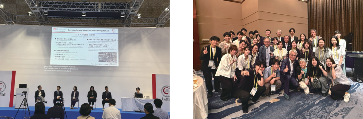| 大阪万博での岡山大学の講演 | 国内大学生参加者とレセプション会場にて |
