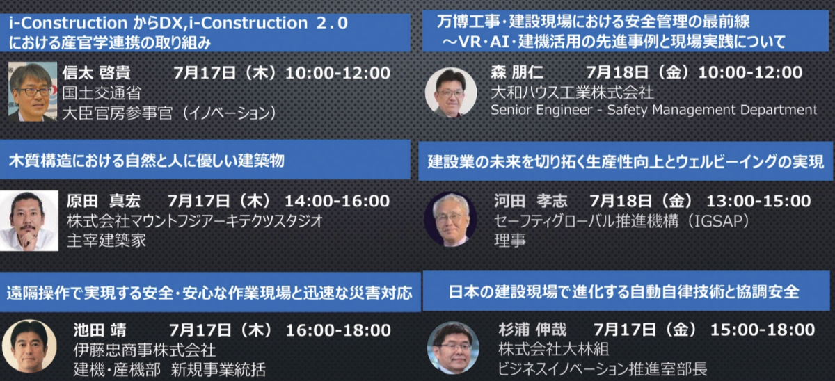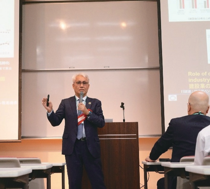 7月18日にはGISHW (Global Intiative for Safety,Health & Well-Being)のメインステージにおいて、岡山大学は「Creating the Ideal Workplace Together at the University」と題して、岡山大学でのWell-Beingへの取組に関する講演を那須学長他6名のスタッフにより行われました。岡山大学は全国展開を可能とする強固な連携体制(国家戦略特区に関連する大学:筑波大学、山梨大学、大阪大学、大阪公立 大学、金沢大学)の基、自治体および産業界と連携し、心身のWell-Being・人の健康 (Human Health) および安全・安心に暮らせる地域の健康 (Community Health) の実現に取組んでいます。那須学長が率先する岡山大学のSDGs、Well-Beingの推進に環会としても応援させていただきたいと思っています。INTEX大阪会場では、建設業における安全・健康・ウェルビーイングのプラクティス・セッションを開催、6セクション、35名の講演、最新技術の展示が行われました。