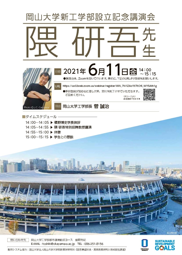 問合せ先:岡山大学工学部都市環境創成コース 綾野克紀14:05~14:55 隈研吾特別招聘教授講演