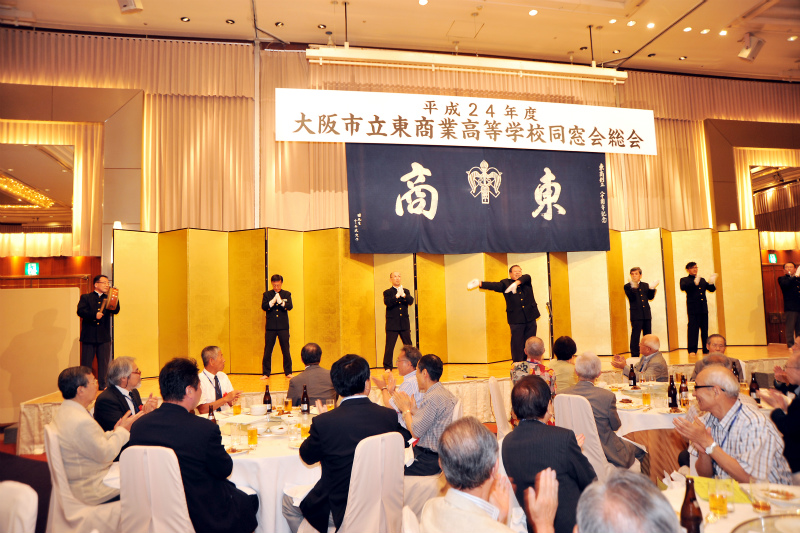 引き続き【厳粛な総会】から【わくわくした雰囲気】の懇親会に進みました。実行委員長の挨拶、恩師の紹介、乾杯へと続き、ヒルトン大阪のフランス人のコック長が腕によりを掛けた料理とみんなの楽しい会話で会場は華やいできた後、24期のメンバーが太鼓と笛の演奏で三三七拍子と【生駒にかかる雲はれて…】の東商応援歌にみんな大合唱になりました。