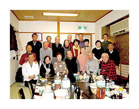 定刻になり、まず記念写真を撮影。物故者への黙祷があり、会長のあいさつと乾杯で懇親会に移る。食事と懇親の時間が始まる。健康問題や孫のこと、大阪の都構想などあちこちで談笑が広がる。