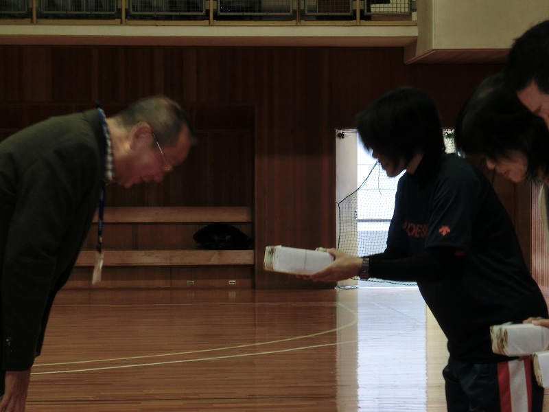 卒業生を代表して水本順敏さん(23期)のご挨拶、浜口卯一同窓会々長に祝辞をいただき、記念品の贈呈式となりました。お世話になった恩師の先生方6名・コーチ8名の合計14名の方に贈呈いたしました。