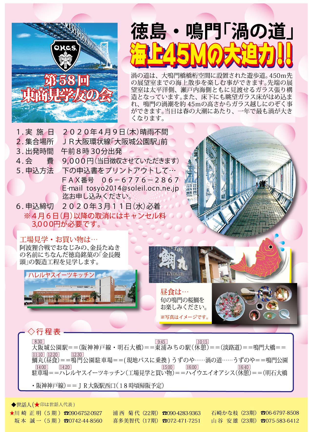 今回予定いたしておりました第58回見学友の会は、コロナウィルスの影響を考慮いたしまして中止とさせていただきました。尚、次回は2020年9月5日(土)、行先は徳島鳴門「渦の道」他です。お楽しみに!